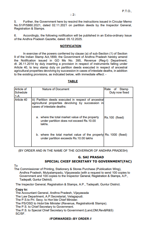 ఈ ఇబ్బందులను గమనించిన ఏపీ ప్రభుత్వం వారసత్వ వ్యవసాయ భూముల రిజిస్ట్రేషన్ ప్రక్రియను సులభతరం చేస్తూ ఒక కీలకమైన జీవోను విడుదల చేసింది. ఈ జీవో ప్రకారం.. రూ.10 లక్షల లోపు విలువ ఉంటే: సబ్-రిజిస్ట్రార్ కార్యాలయం నిర్ధారించిన మార్కెట్ విలువ ప్రకారం ఆస్తి విలువ రూ.10 లక్షల లోపు ఉంటే, వారసులు స్టాంప్ డ్యూటీగా కేవలం రూ.100 (వంద రూపాయలు) మాత్రమే చెల్లిస్తే సరిపోతుంది.
